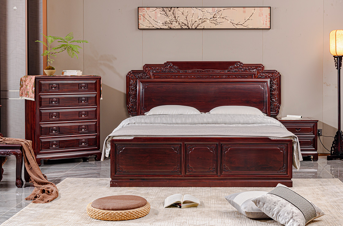 一個舒適、健康的臥室,更能為睡眠帶來安寧、舒心。紅木大床溫潤的質感,搭配柔軟的床品,編織出美好睡眠體驗。